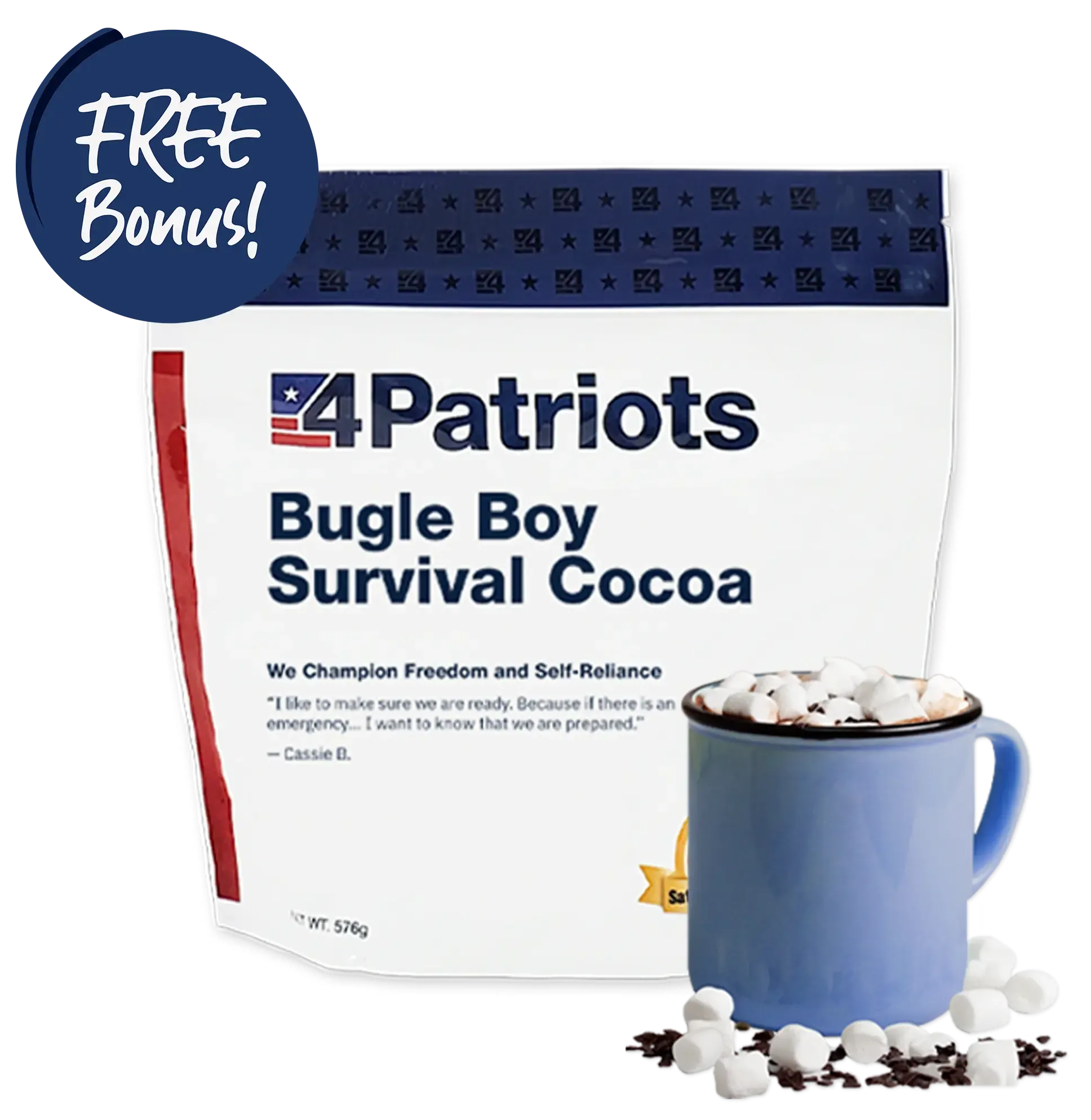 Warm up with our 4Patriots Bugle Boy Survival Cocoa. Each cup of chocolatey goodness is sure to satisfy the young… and the young at heart. With your Survival Cocoa Kits, you'll have the satisfying comfort of a steaming cup of cocoa when you and your loved ones need it most.