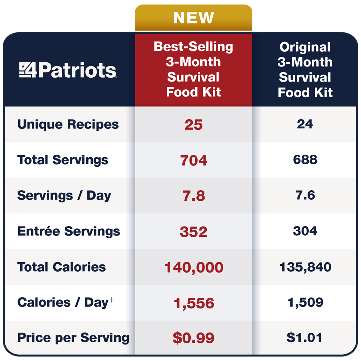 Introducing our #1 best-selling Deluxe 3-Month Survival Food Kit – now better than ever with NEW recipes, MORE servings & MORE calories - at no additional cost.