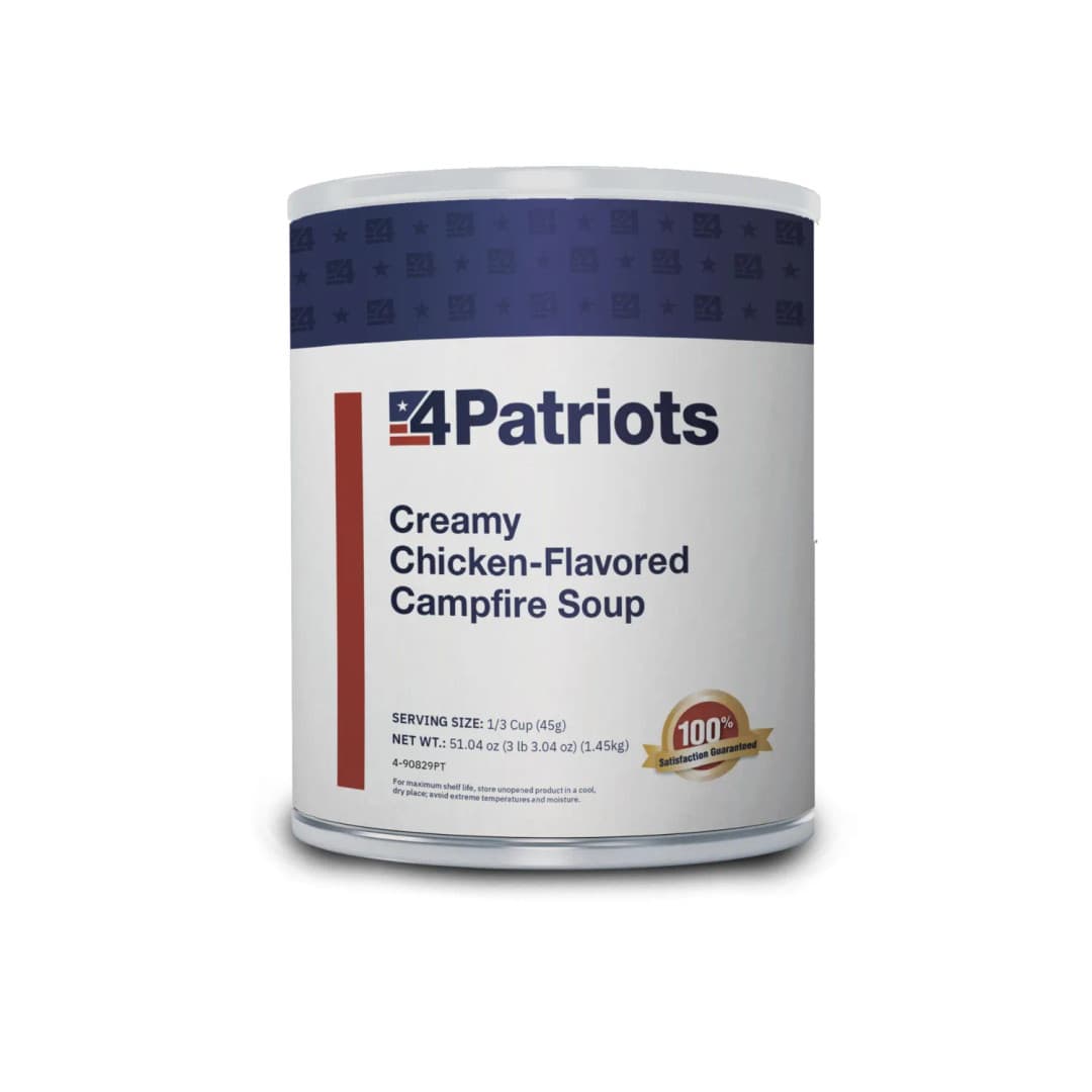 32 Servings in Every Can! Rich, flavorful soup that’s easy to prepare and perfect for emergencies or everyday meals. Our Creamy Chicken-Flavored Campfire Soup will provide a hearty meal any time.